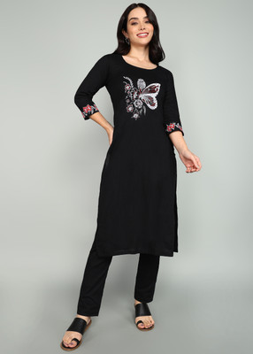 Stitched from a viscose and rayon blend, the Anvi Creation Embroidered Women’s Straight Kurta is lightweight and feels soft against the skin, keeping you comfortable throughout the day Designed with an A-line cut, three-quarter sleeves, and attractive embroidery, this dress is not only comfortable but also stylish. Moreover, the side slits of this kurta allow for easy movements