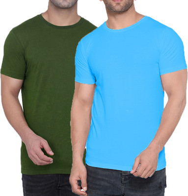 Kroptee Boys Solid Cotton Blend Regular T Shirt(Light Blue, Dark Green, Pack of 2)