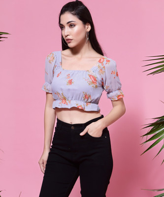 Grey Floral Print Crop Top in Georgette fabric with Square Neck and Short Sleeve