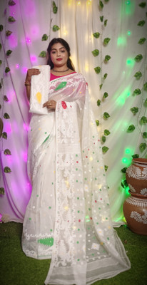 OWALID Self Design Jamdani Cotton Silk Saree(White)