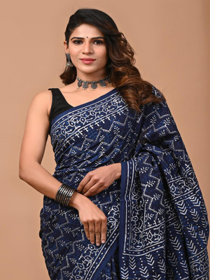 Taavi Blocked Printed Daily Wear Cotton Blend Saree(Blue) | Zipri.in
