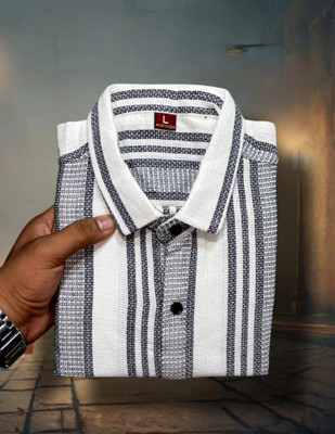 VUDLY Men Checkered, Striped, Self Design, Solid, Dyed/Ombre Casual White, Black Shirt | Zipri.in